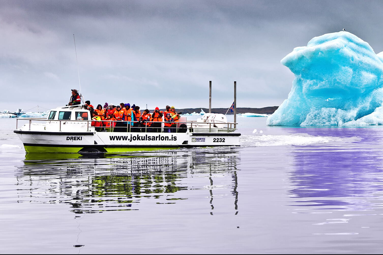 - Tham quan lagune băng Jökulsárlón bằng tàu đặc chủng (đi được trên bờ và dưới nước) , nơi nổi tiếng với những khối băng trôi sáng lấp lánh như kim cương trên nền cát đen. Nơi này từng xuất hiện trong nhiều phim Hollywood nổi tiếng: James Bond – Die Another Day, Batman Begins, và Tomb Raider. Đầm phá này sâu khoảng 250 mét, là hồ sâu nhất ở Iceland.
